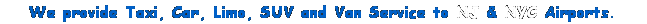 | We serving all major Airports 20% Off Online Booking Serving your area. * Exclusive Deals and Offers * Signature Service and Style Airport Services : - John F. Kennedy Airport (JFK) - Newark Liberty International Airport (EWR) - Westchester Airport (HPN) - Teterboro Airport (TEB) - LaGuardia Airport (LGA) - Morristown Municipal Airport (MMU) - Philadelphia International Airport (PHL) - Atlantic City Airport (ACY) - Lehigh Valley International Airport (ABE) * Airport & Train Station Service * Corporate Transportation * Large Group Shuttles * Road Shows * Concerts & Sporting Events * Weddings & Proms * Nights-On-The-Town |