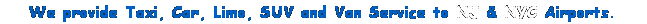 | We serving all major Airports 20% Off Online Booking Serving your area. * Exclusive Deals and Offers * Signature Service and Style Airport Services : - John F. Kennedy Airport (JFK) - Newark Liberty International Airport (EWR) - Westchester Airport (HPN) - Teterboro Airport (TEB) - LaGuardia Airport (LGA) - Morristown Municipal Airport (MMU) - Philadelphia International Airport (PHL) - Atlantic City Airport (ACY) - Lehigh Valley International Airport (ABE) * Airport & Train Station Service * Corporate Transportation * Large Group Shuttles * Road Shows * Concerts & Sporting Events * Weddings & Proms * Nights-On-The-Town |