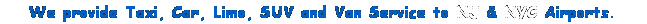 | We serving all major Airports 20% Off Online Booking Serving your area. * Exclusive Deals and Offers * Signature Service and Style Airport Services : - John F. Kennedy Airport (JFK) - Newark Liberty International Airport (EWR) - Westchester Airport (HPN) - Teterboro Airport (TEB) - LaGuardia Airport (LGA) - Morristown Municipal Airport (MMU) - Philadelphia International Airport (PHL) - Atlantic City Airport (ACY) - Lehigh Valley International Airport (ABE) * Airport & Train Station Service * Corporate Transportation * Large Group Shuttles * Road Shows * Concerts & Sporting Events * Weddings & Proms * Nights-On-The-Town |